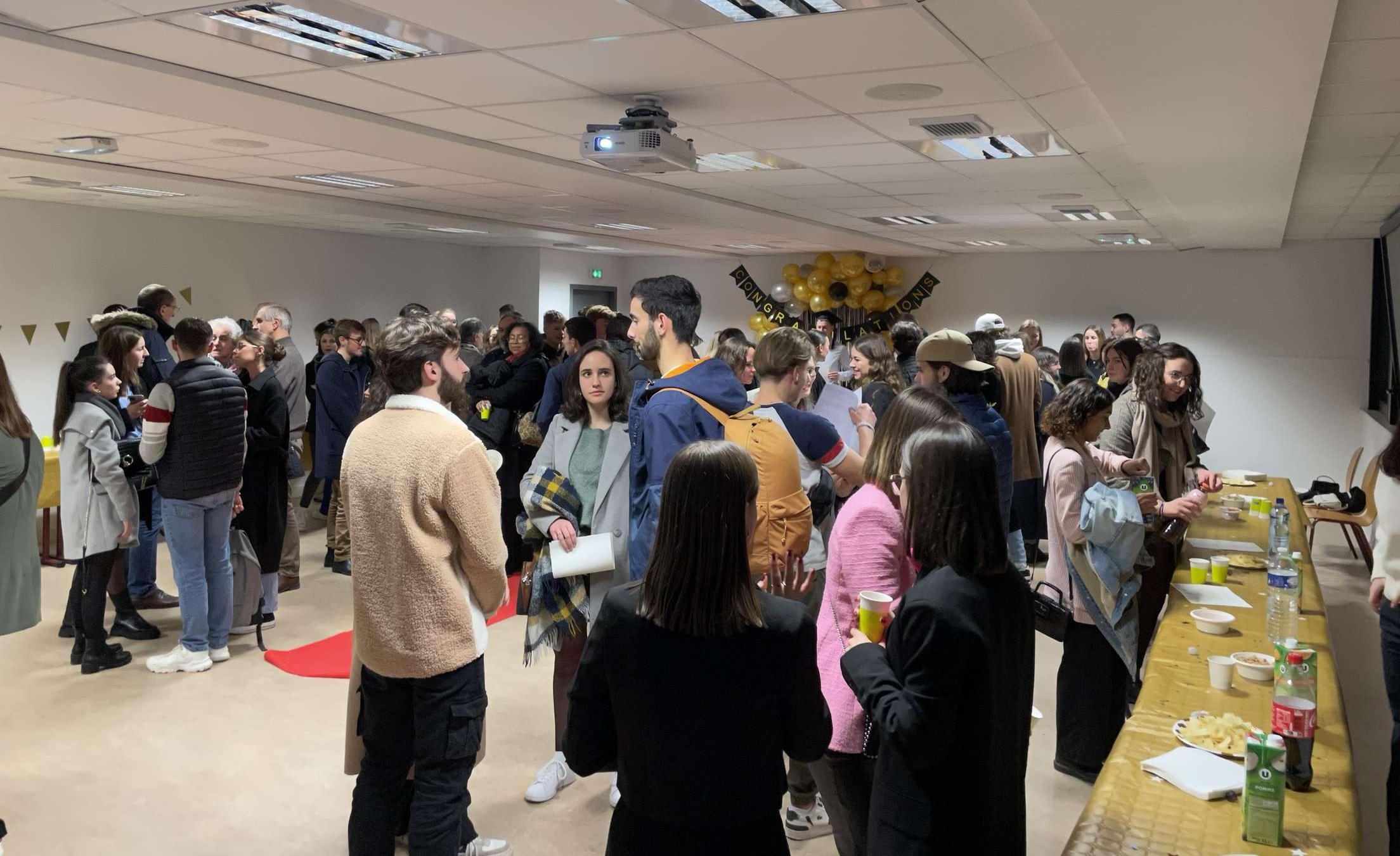 Après le discours d'un des majors de promotion, les anciens élèves ont pu récupérer leurs diplômes avant de se retrouver autour d'un verre. Ce moment de partage leur a permis d'échanger avec leurs anciens professeurs, mais aussi de retrouver leurs camarades de GEA. Un stand photo était mis à leur disposition avec des accessoires pour immortaliser ce moment.