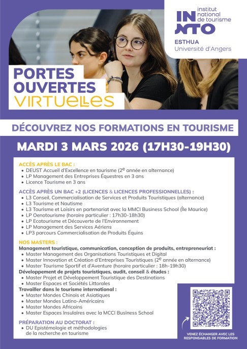 L'ESTHUA-INNTO vous ouvre ses portes virtuellement le mardi 3 mars 2026 à partir de 17h30 et jusqu'à 19h30. Suite à une présentation de la formation vous pourrez poser vos questions auprès des enseignants, responsables de formation, directement en visioconférence.