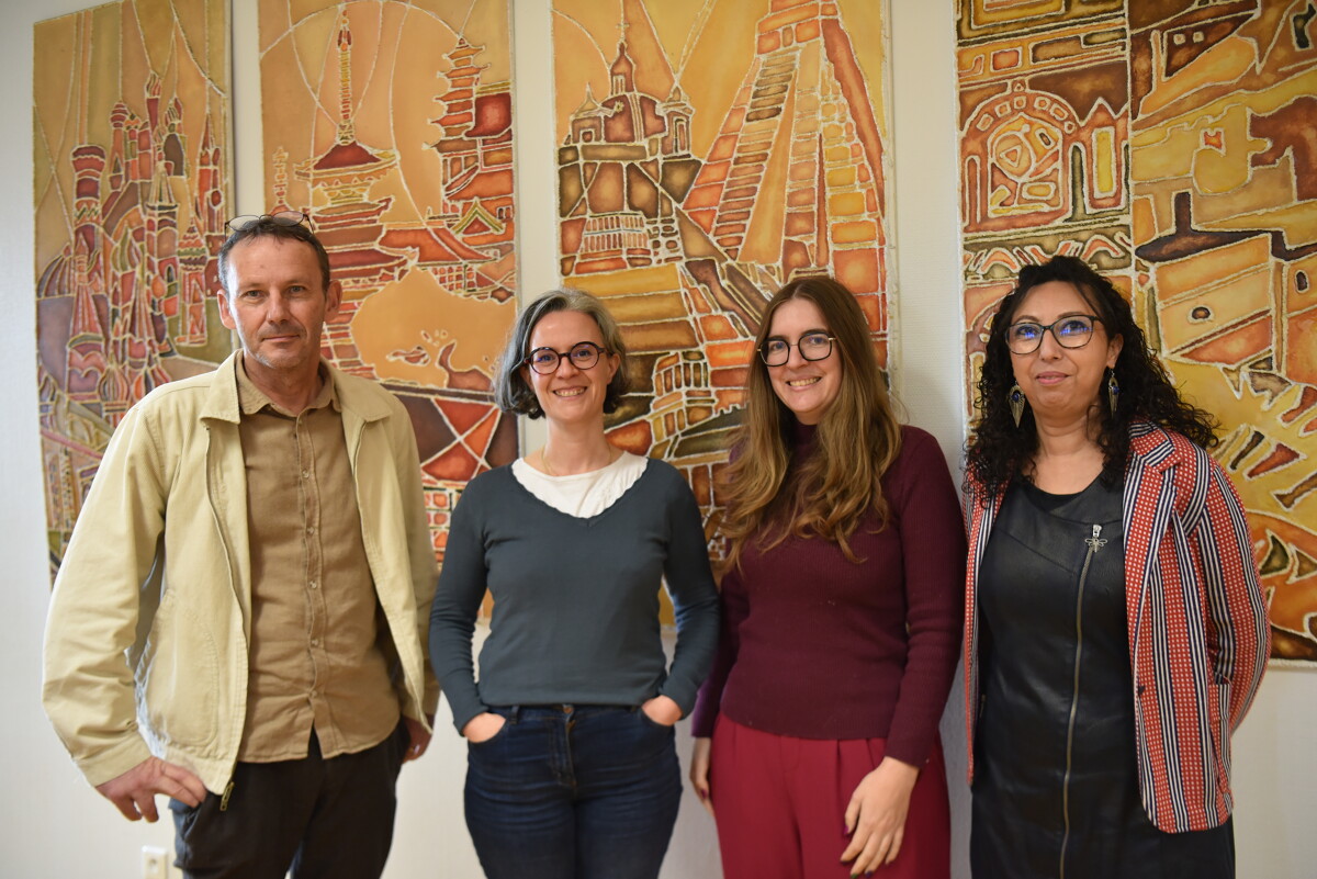 Emmanuel Gratton, maître de conférences HDR en psychologie, adjoint à la SFR, Carole Avignon, maîtresse de conférences en histoire médiévale, adjointe à la SFR, Anne-Laure Guillaumat, chargée de coordination et de valorisation, et Chadia Arab., directrice de la SFR.Elle arrive en terrain connu. Chadia Arab a pris les rênes de la SFR Confluences le 26 septembre, après avoir été directrice adjointe entre 2017 et 2022. Elle co-anime également l’axe 2 « Changement social : genre, discriminations et inégalités » depuis 2012. « C’est un nouveau défi, reconnaît-elle. La question de l’interdisciplinarité a toujours été au cœur de mes recherches sur les immigrations et le genre. C’est un projet collectif, je souhaite avoir une direction collégiale, démocratique et transparente. Nous sommes d’ailleurs à la recherche d’un troisième adjoint, issu de Saint-Serge, afin de garder un équilibre entre les sites et les laboratoires. »